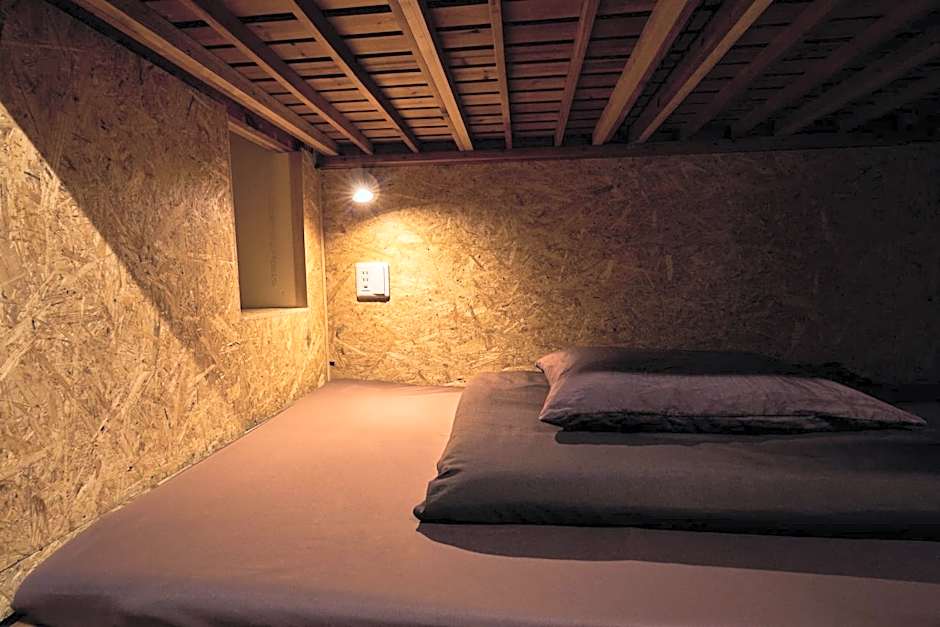 A private sleeping capsule in a shared space. Toilets and showers are shared. Each bed has a reading light, an outlet, and curtains. Smoking is permitted on the balcony.